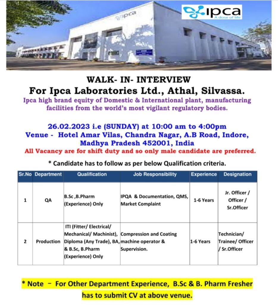 Ipca – Walk-in Interview for QA, Production on 26th Feb 2023 at Indore