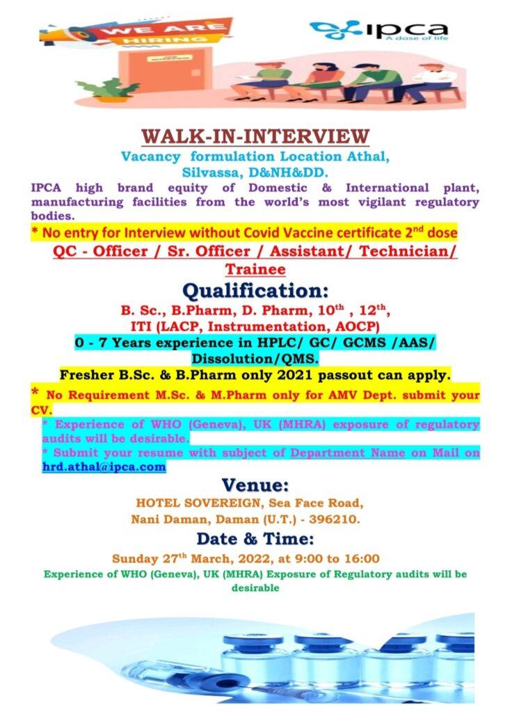 IPCA Walk In Interview for Freshers & experience B.Sc./B.Pharm/ D. Pharm/ 10th/ 12th/ ITI candidates for QC on 27th March, 2022 @Nani Daman, Daman