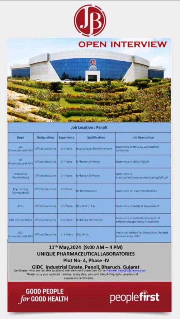 J.B Pharma walk in interview on 11th May, 2024 at Panoli