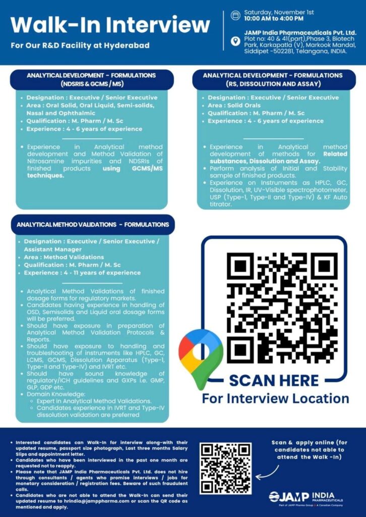 Hyderabad, November 1, 2025 – JAMP India Pharmaceuticals Pvt. Ltd., a part of the globally recognized JAMP Pharma Group, is conducting a walk-in interview for multiple Analytical Development and Formulation roles at its R&D Facility in Hyderabad. This recruitment drive offers excellent opportunities for experienced professionals in the pharmaceutical sector to join one of India’s leading research-driven companies.