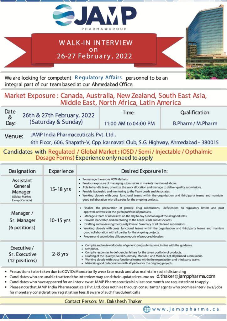 Candidates who are unable to attend the interview may send their updated resume on d.thaker@jamppharma.com