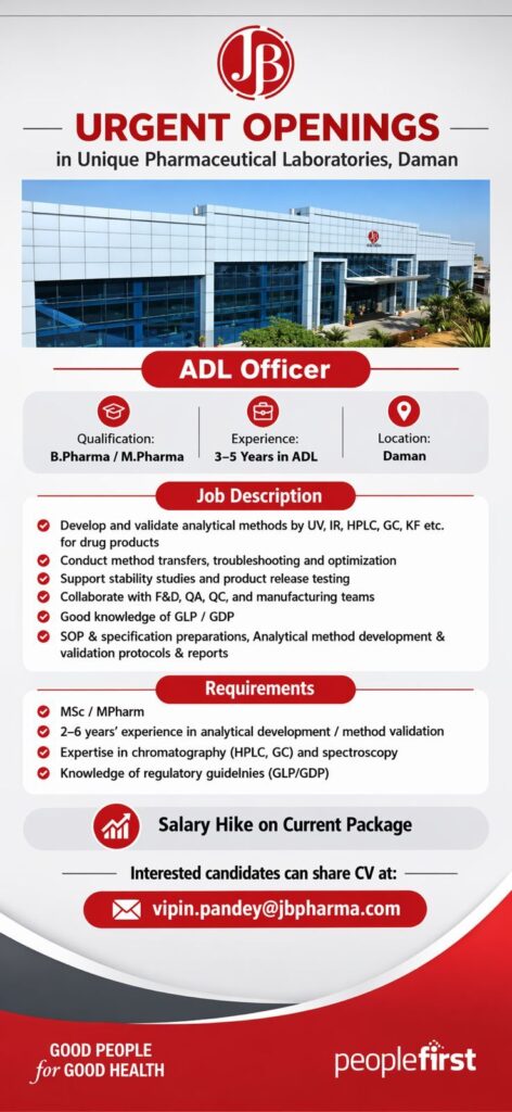 Unique Pharmaceutical Laboratories, a division of JB Pharma, has announced urgent openings for the position of ADL Officer at their state-of-the-art facility in Daman. This is a prime opportunity for pharmaceutical professionals to join a leading organization committed to “Good People for Good Health.”