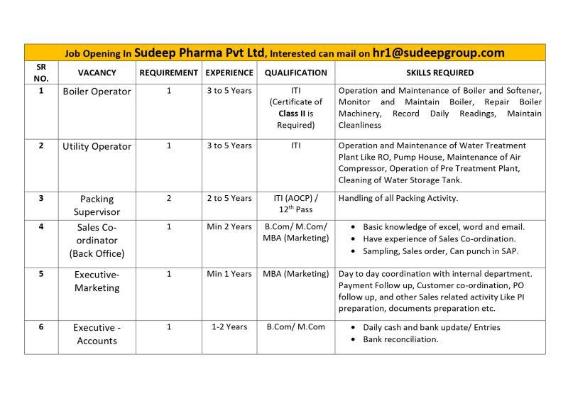 Job Opening for Boiler Operator, Utility Operator, Packing Supervisor, Sales Co ordinator, Executive Marketing, Executive – Accounts at Sudeep Pharma Pvt Ltd.