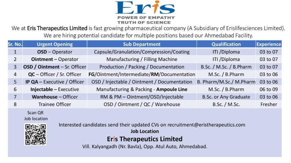 We at Eris Therapeutics Limited is fast growing pharmaceutical company (A Subsidiary of Eris Lifesciences Limited). We are hiring potential candidate for multiple positions based our Ahmedabad Facility.