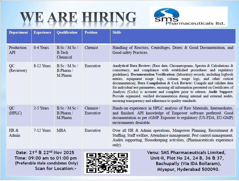 SMS Pharmaceuticals Ltd. is hiring experienced and qualified candidates to join their team in Hyderabad. We are looking for dedicated individuals to fill various positions across our Production (API), Quality Control (QC), and HR & Admin departments.