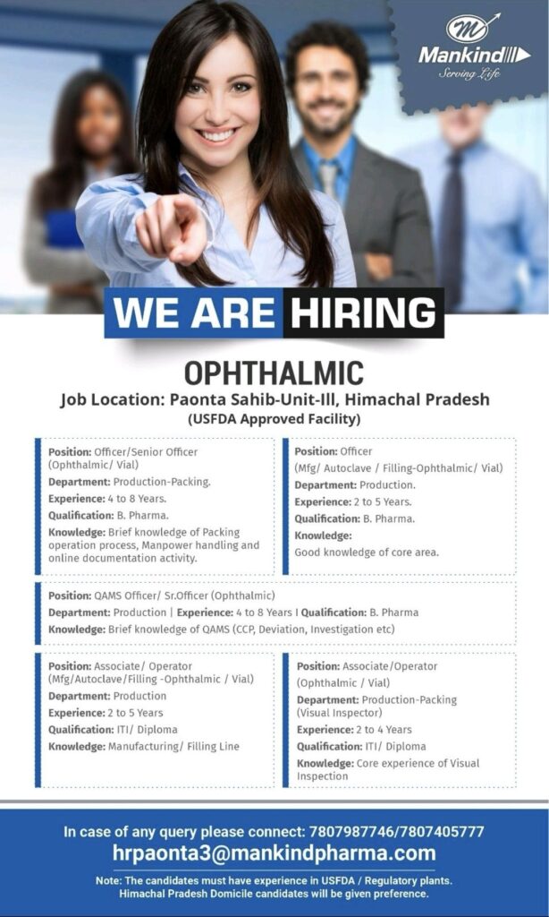 Note: The candidates must have experience in USFDA/Regulatory plants. Himachal Pradesh Domicile candidates will be given preference.
