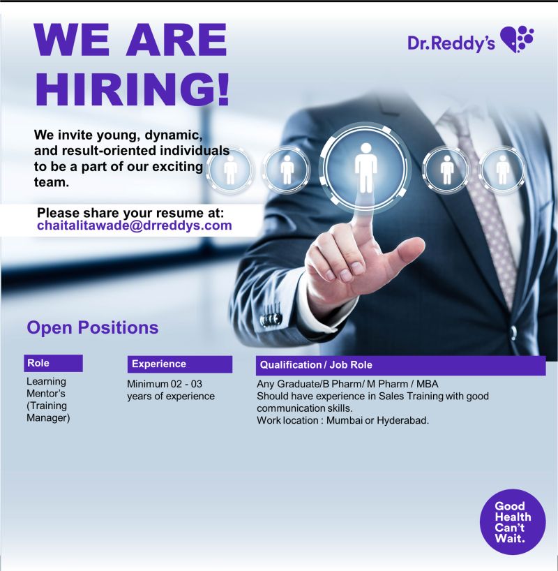 Job Vacancies for Sales Training Manager role at Dr. Reddy’s at Hyderabad & Mumbai location