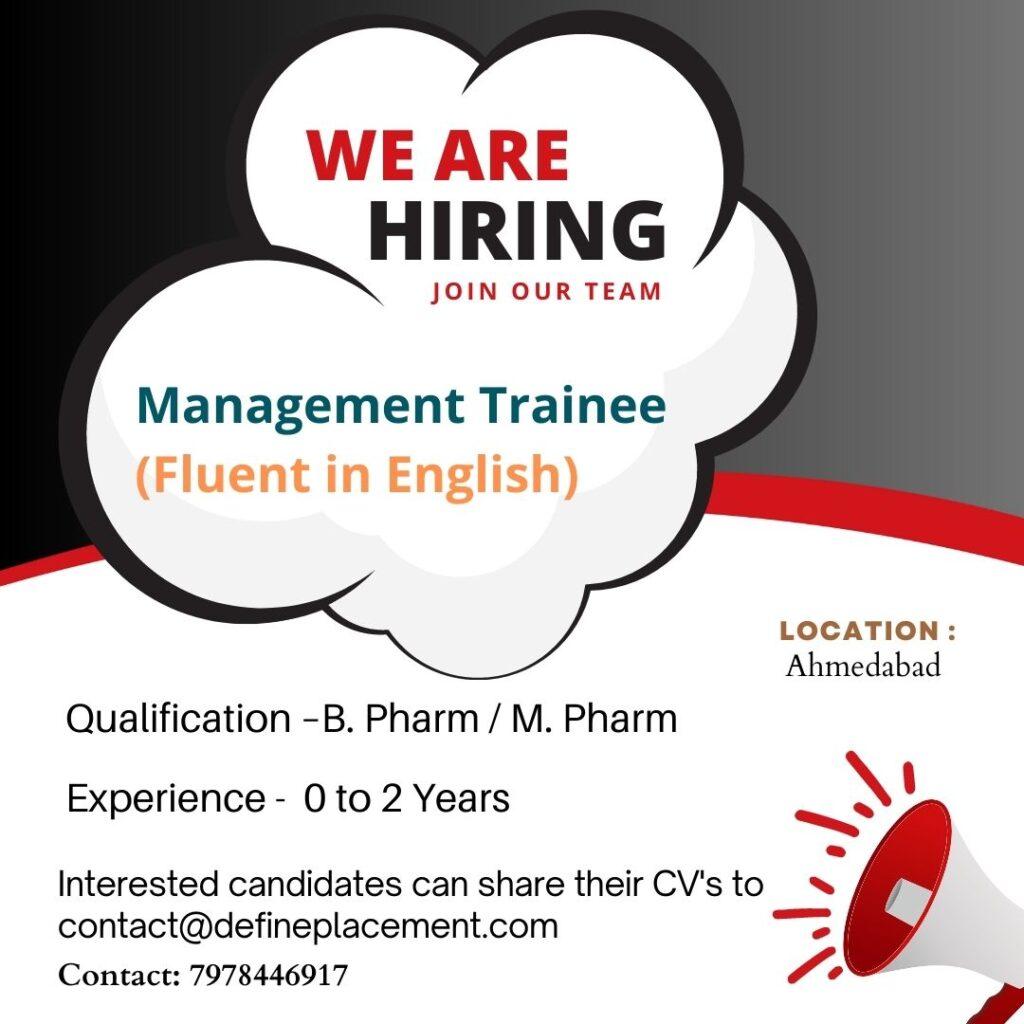 Job vacancy for B. Pharm / M. Pharm Freshers & Experience- Management Trainee (Fluent in English) at Ahmedabad