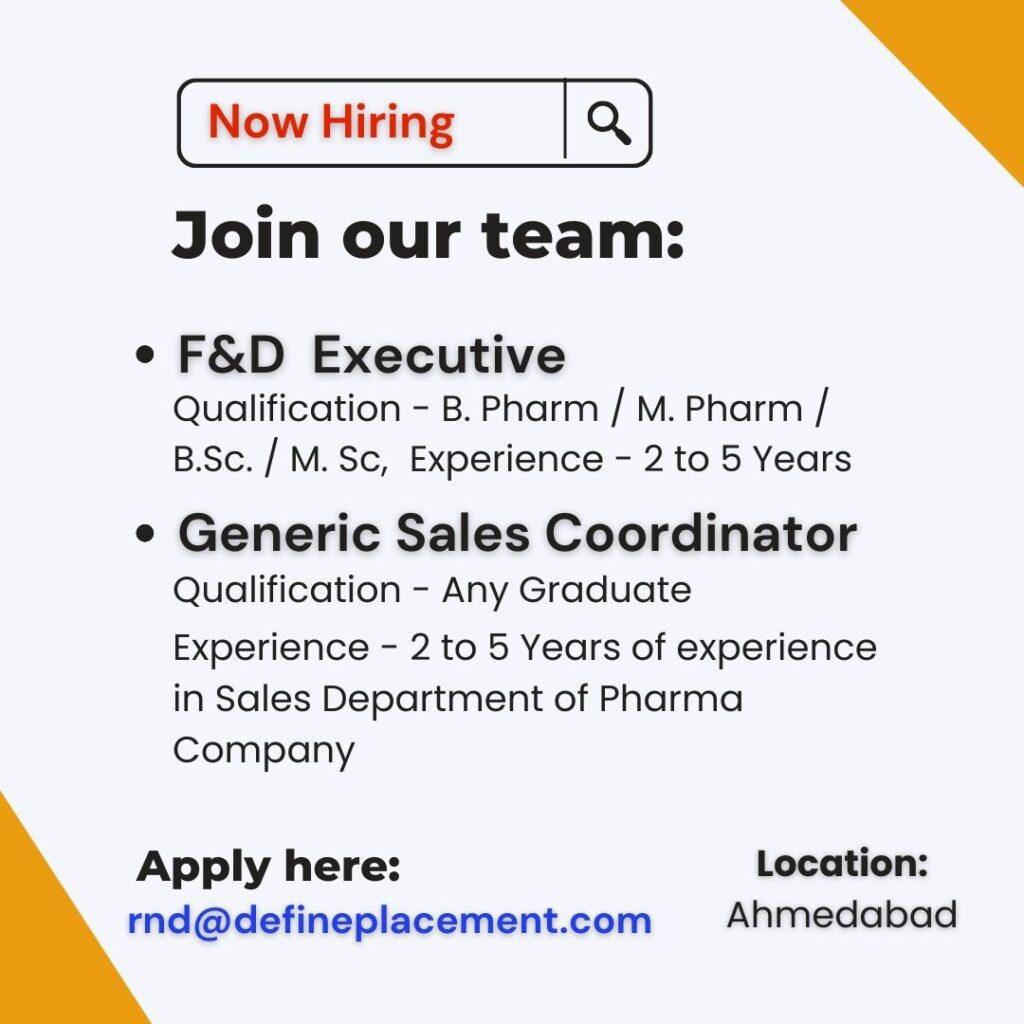 Job vacancy for F&D Executive, Generic Sales Coordinator at Ahmedabad location