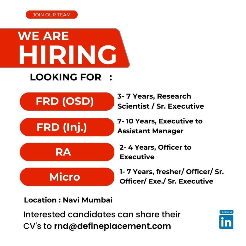 Job vacancy for FRD (OSD/ Inj.), Regulatory Affairs & Micro at Mumbai