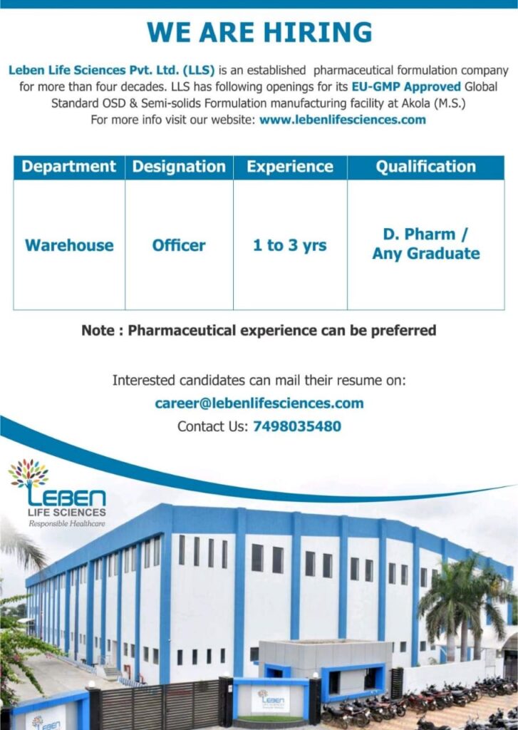 We are hiring for Officer in Warehouse Department at Leben Life Sciences Pvt. Ltd. Akola, M.S