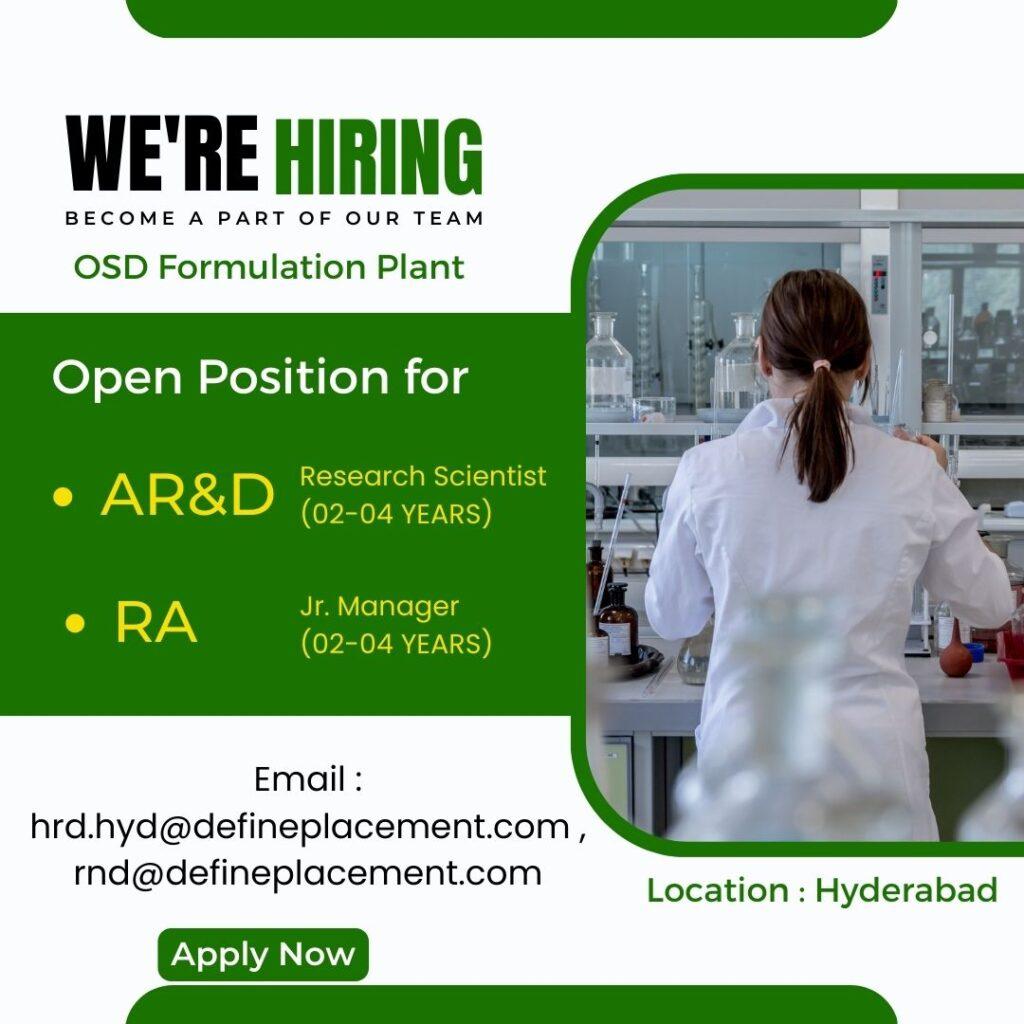 Job vacancy for Regulatory Affairs & Analytical Research & Development at Hyderabad