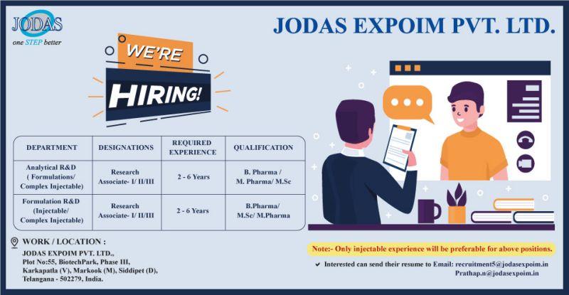 JODAS EXPOIM looking for Analytical R&D, Formulation R&D department