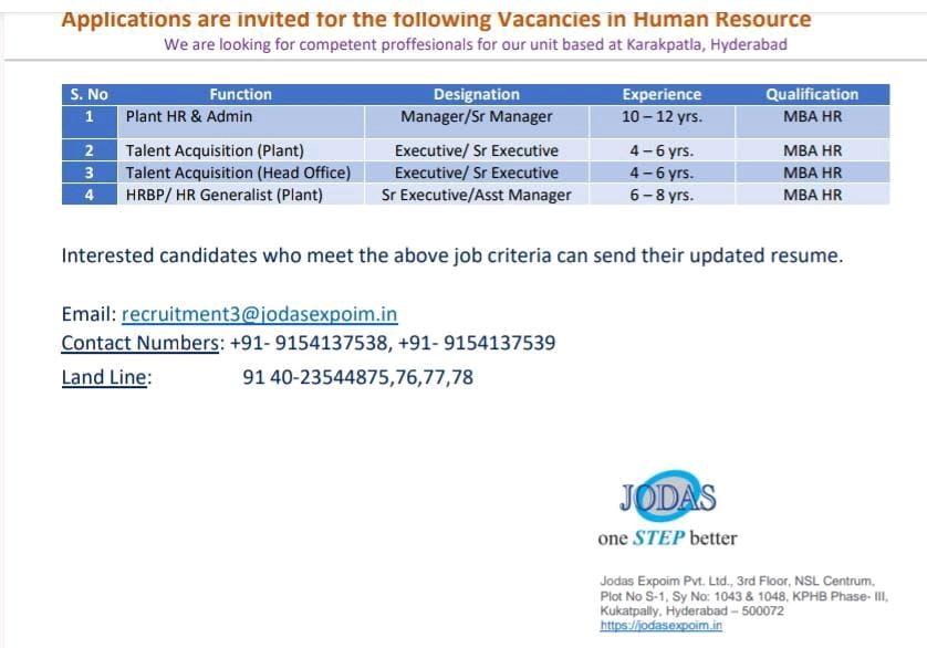 Applications are invited for the following Vacancies in Human Resource We are looking for competent proffesionals for our unit based at Karakpatla, Hyderabad