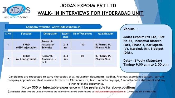 Walk in details- Jodas Expoim Pvt Ltd, Plot No 55, Industrial Biotech Park, Phase 3, Karkapatla (V), Marakuk (M), Siddipet (Dist).