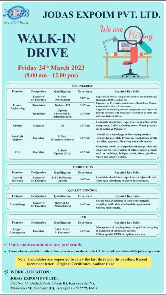 JODAS EXPOIM – WALK-IN DRIVE for multiple opening in R&D, Production & QC on 24th March 2023