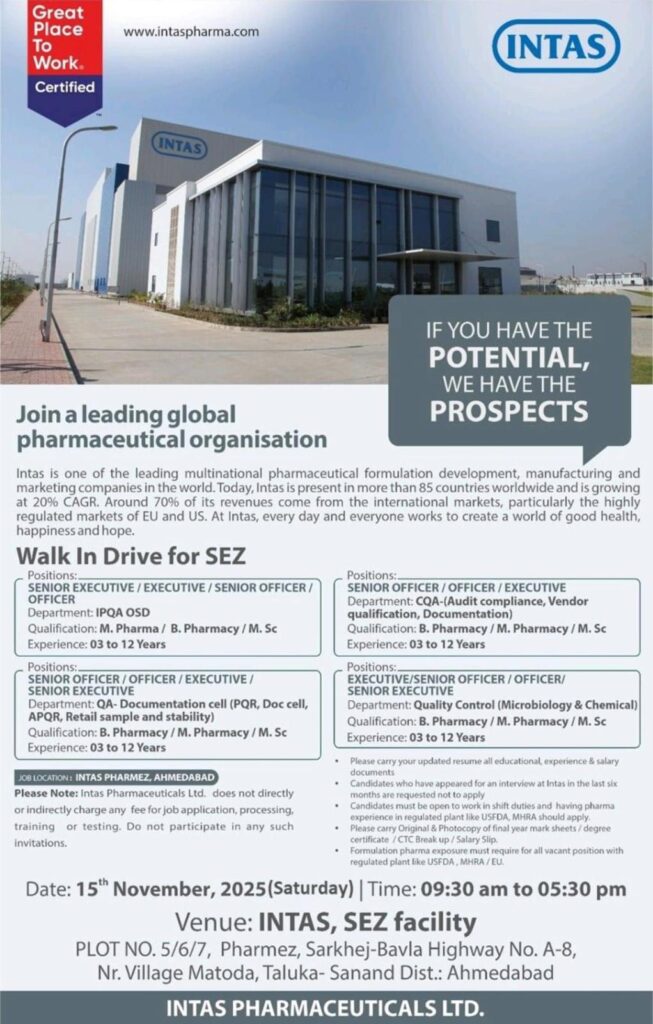 Intas Pharmaceuticals, a leading multinational pharmaceutical organization known for its strong global presence and commitment to health, is conducting a Walk-in Drive for its INTAS PHARMEZ, SEZ facility in Ahmedabad. If you have the potential, Intas has the prospects!
