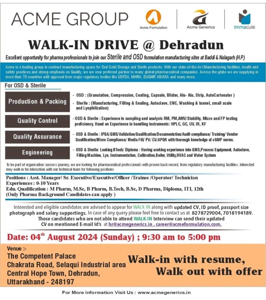 ACME GROUP walk-in drive for OSD & Sterile- QA, QC, Engineering, Production & Packing on 04th August 2024 (Sunday)