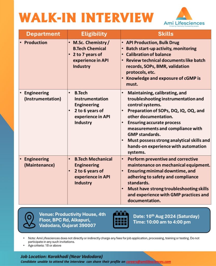 Ami Lifesciences is inviting candidates for a Walk-In Interview for its Manufacturing site at Karakhadi (Near Vadodara) on 10th Aug’24 (Saturday)