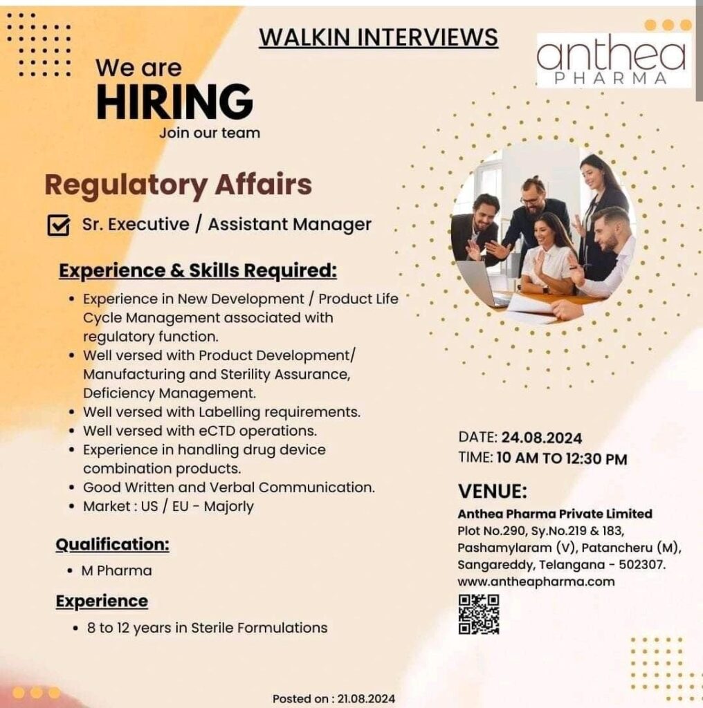 Anthea Pharma walk in interview for Regulatory Affairs on 24.08.2024