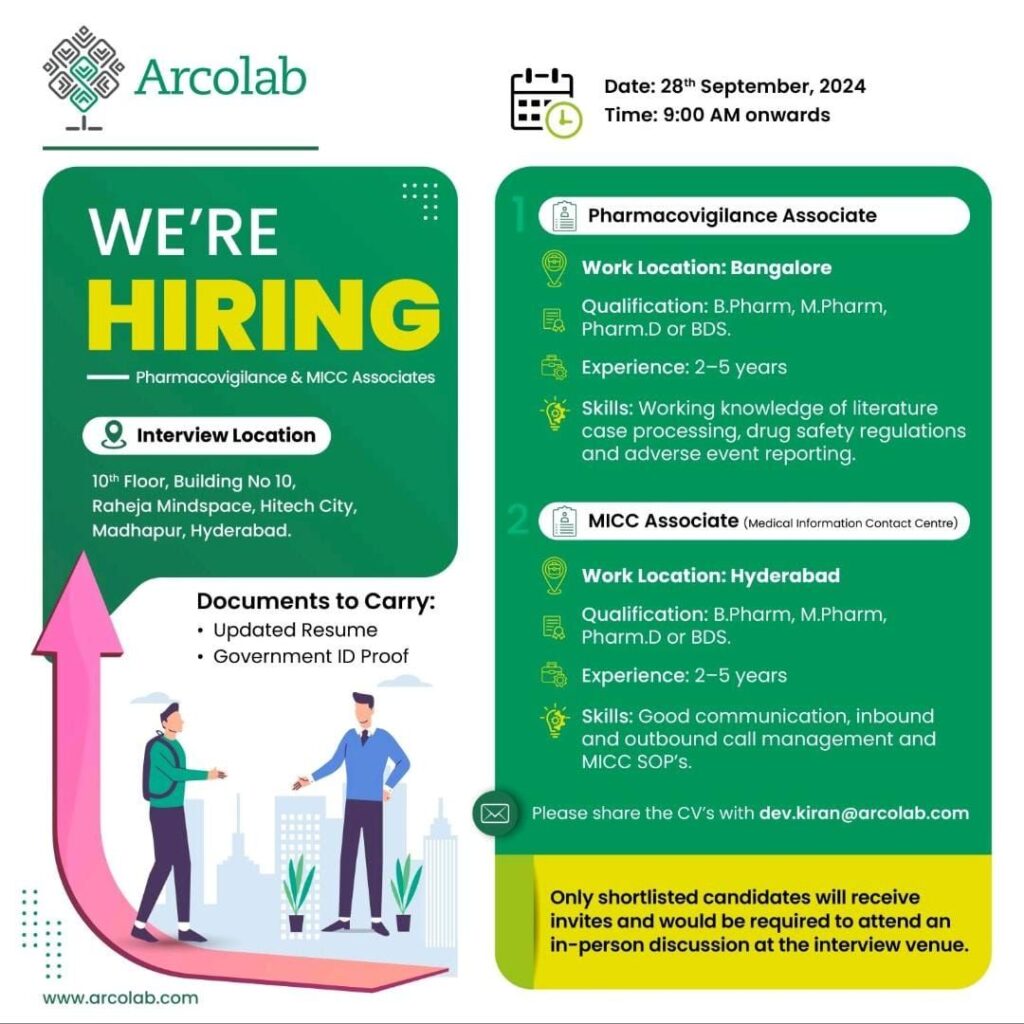 Arcolab is conducting walk-in interviews for Pharmacovigilance and Medical Information Call Center (MICC) Associates on 28th September 2024 at Madhapur, Hyderabad. They are looking for candidates to join their Pharmacovigilance team and MICC department.