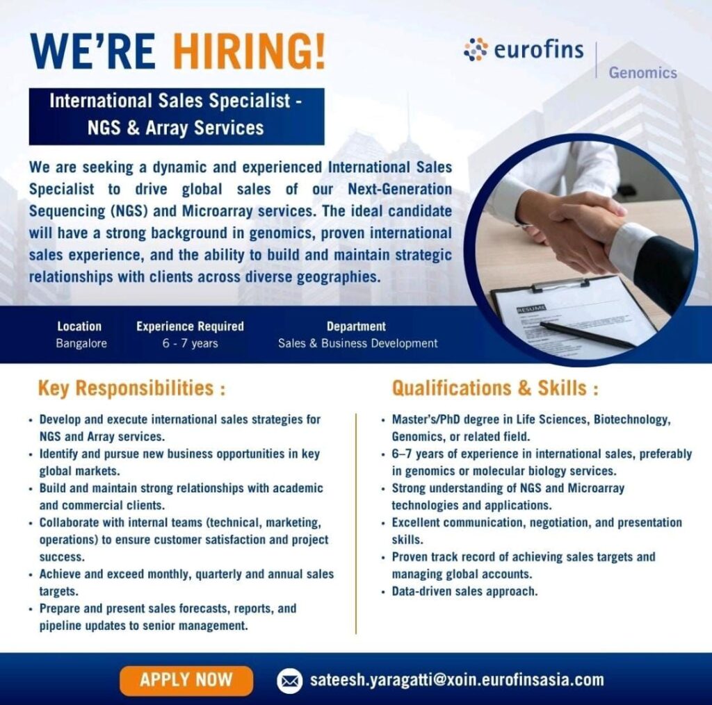 Eurofins Genomics, a global leader in genomics services, is expanding its international footprint and is actively seeking a seasoned professional to join its team as an International Sales Specialist – NGS & Array Services. This strategic role is based in Bangalore and offers an exciting opportunity to drive global sales initiatives in the rapidly evolving fields of Next-Generation Sequencing (NGS) and Microarray technologies.