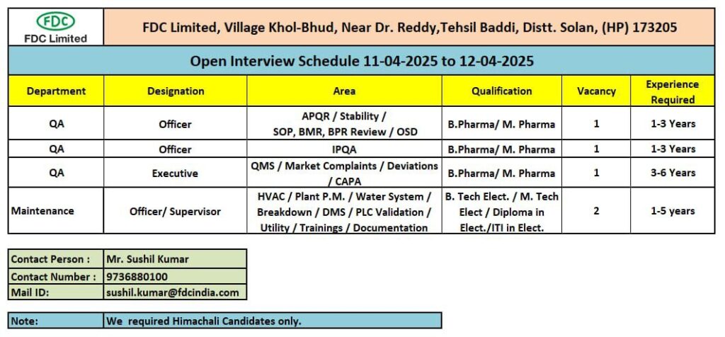 FDC Limited, Village Khol-Bhud, Near Dr. Reddy,Tehsil Baddi, Distt. Solan, (HP) 173205