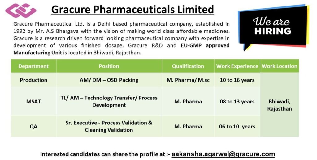 Interested candidates can share the profile at :- aakansha.agarwal@gracure.com