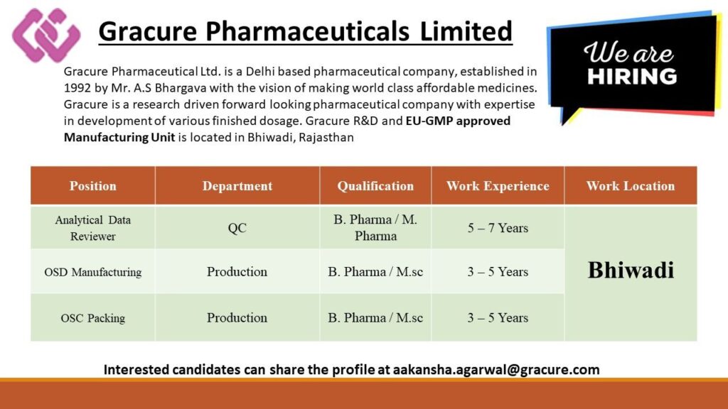 Interested candidates can share the profile at aakansha.agarwal@gracure.com