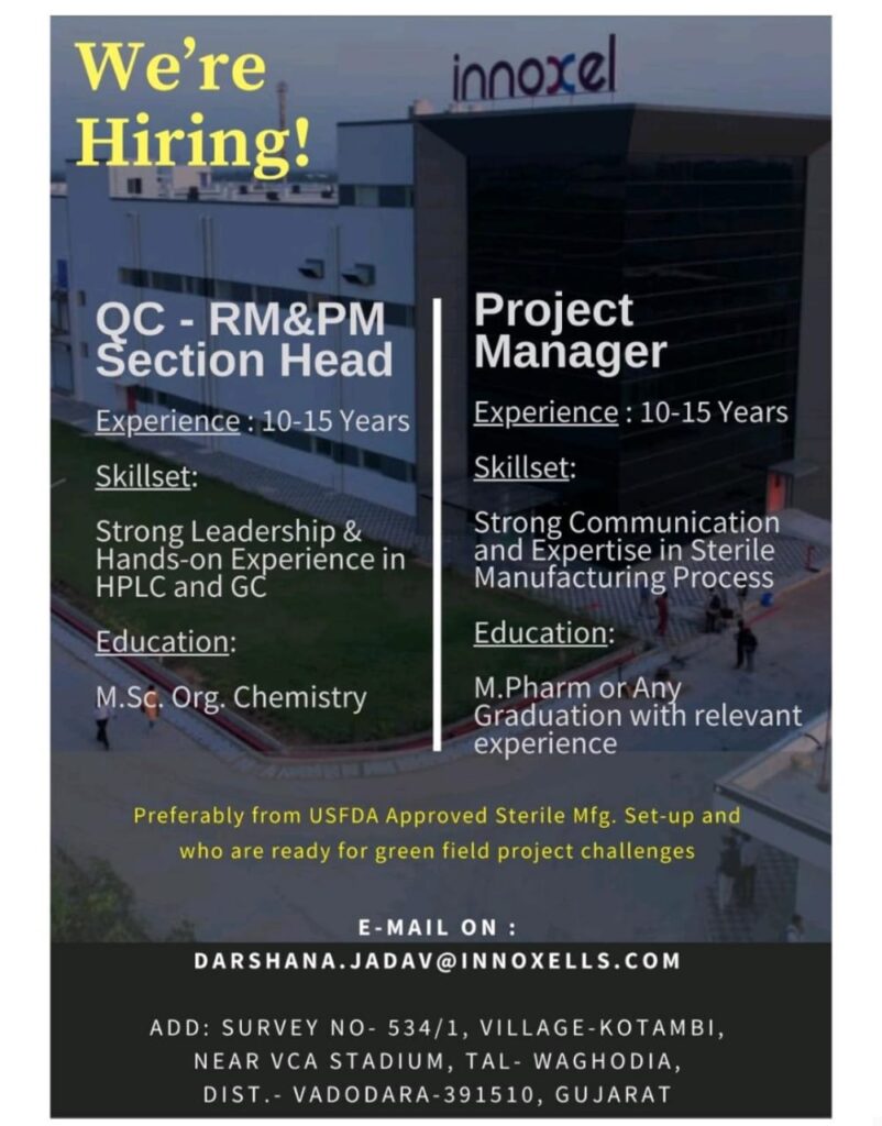 Innoxel Lifesciences hiring QC – RM & PM Section Head/ Project Manager