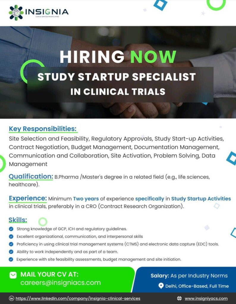 Experience: Minimum Two years of experience specifically in Study Startup Activities in clinical trials, preferably in a CRO (Contract Research Organization).