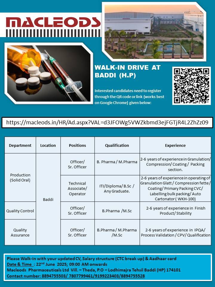 Qualification:B.Pharma / M.Pharma/M.Sc