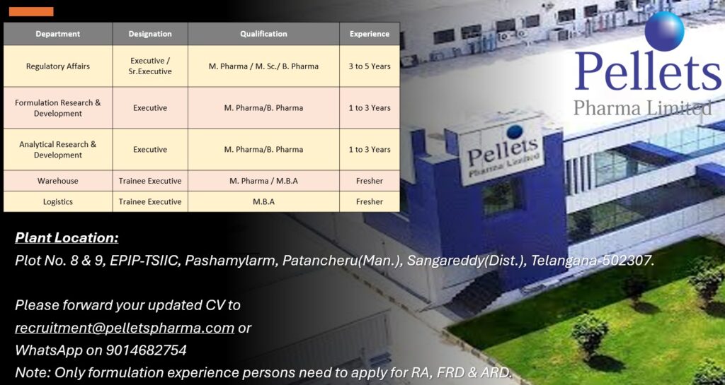 Pellets Pharma Limited hiring for Regulatory Affairs, FR&D, AR&D, Warehouse & Logistics