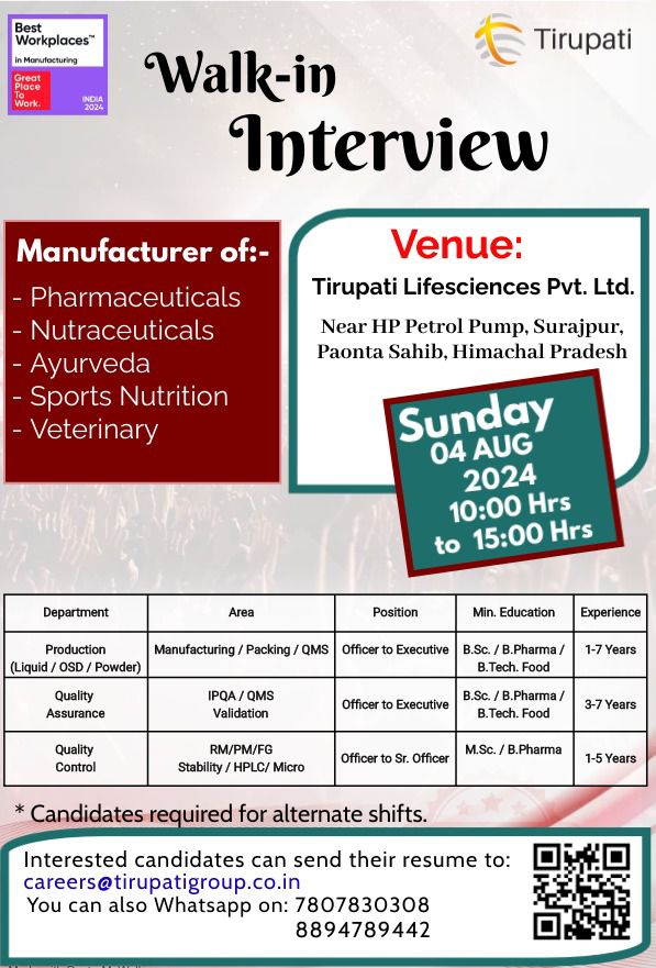 Tirupati Lifesciences Walk-in Interview for QA, QC, Production (Liquid/OSD/Powder) on Sunday 04 Aug 2024