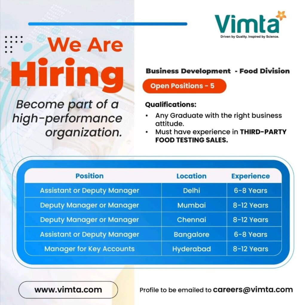 Profile to be emailed to careers@vimta.com