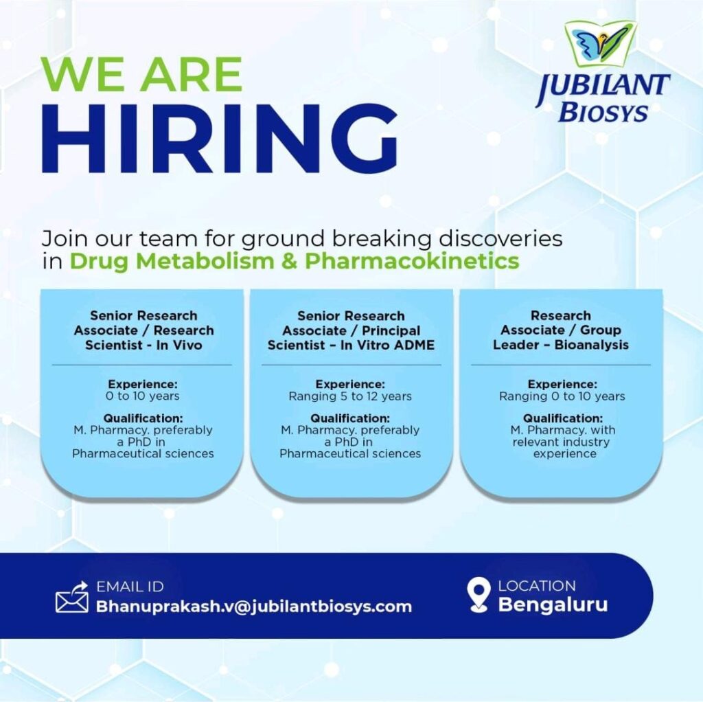 JUBILANT BIOSYS hiring Freshers & experience Senior Research Associate / Research Scientist/ Senior Research Associate / Principal Scientist & Group Leader – Bioanalysis, In Vivo, In Vitro ADME