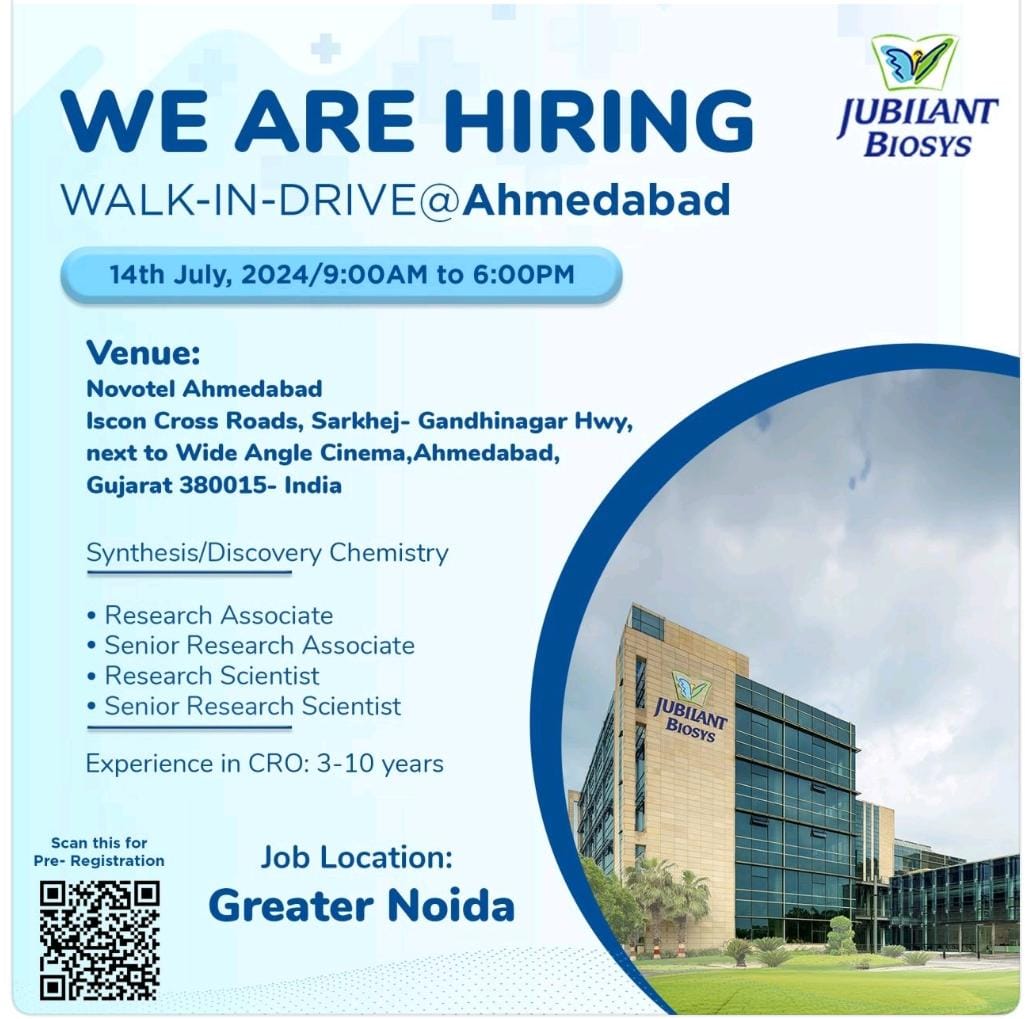Jubilant Biosys Limited walk in drive at Ahmedabad on 14th July, 2024