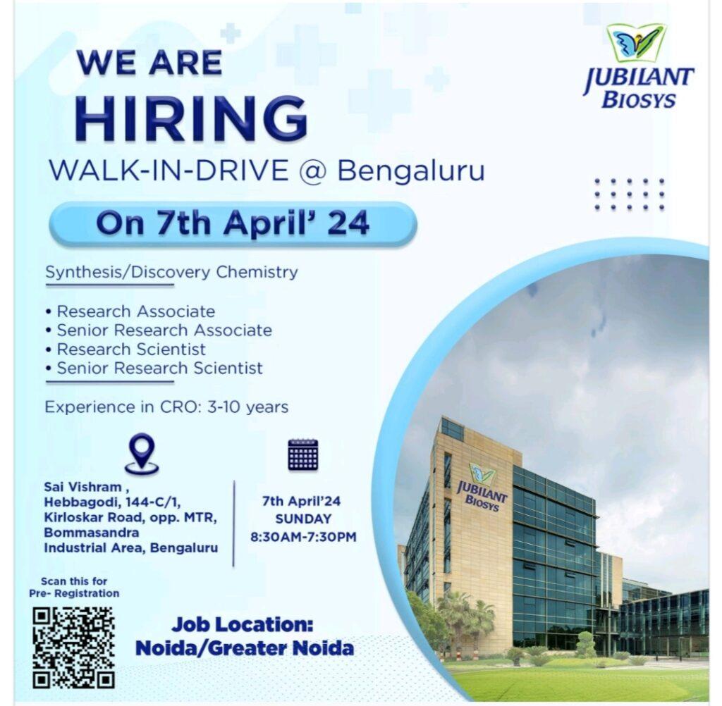 Jubilant Biosys Limited walk in drive @ Bengaluru on 7th April’ 24