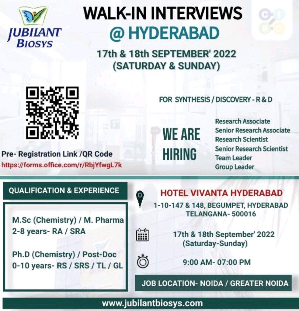 JUBILANT BIOSYS WALK-IN INTERVIEWS For Research Associate, Senior Research Associate, Research Scientist, Senior Research Scientist ,Team Leader on 17th & 18th September 2022