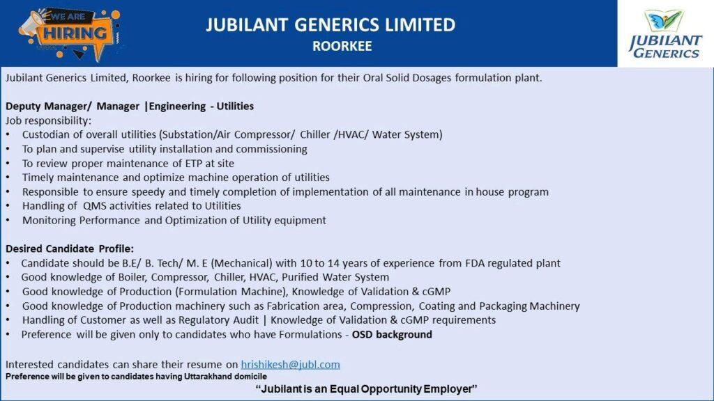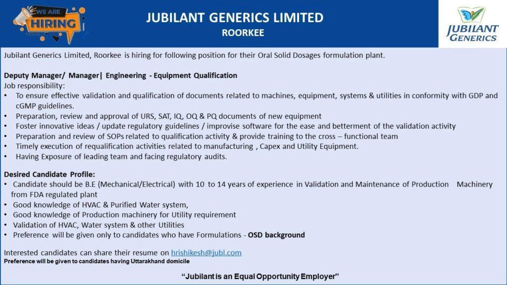 Jubilant Generics Limited, Roorkee is hiring for Deputy Manager/ Manager| Engineering – Equipment Qualification.