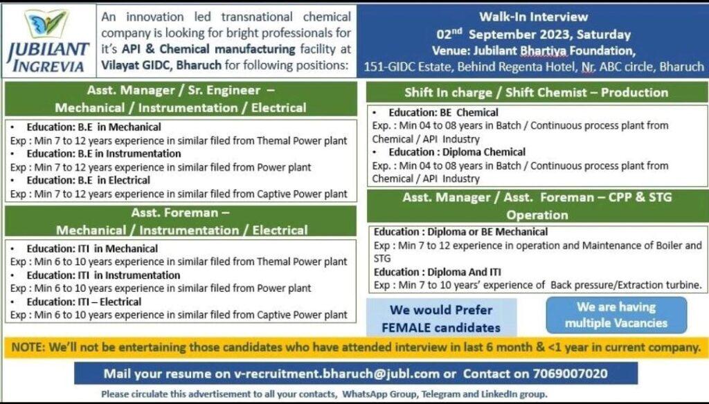 Jubilant – Walk-In Interview on 02nd September 2023, Saturday