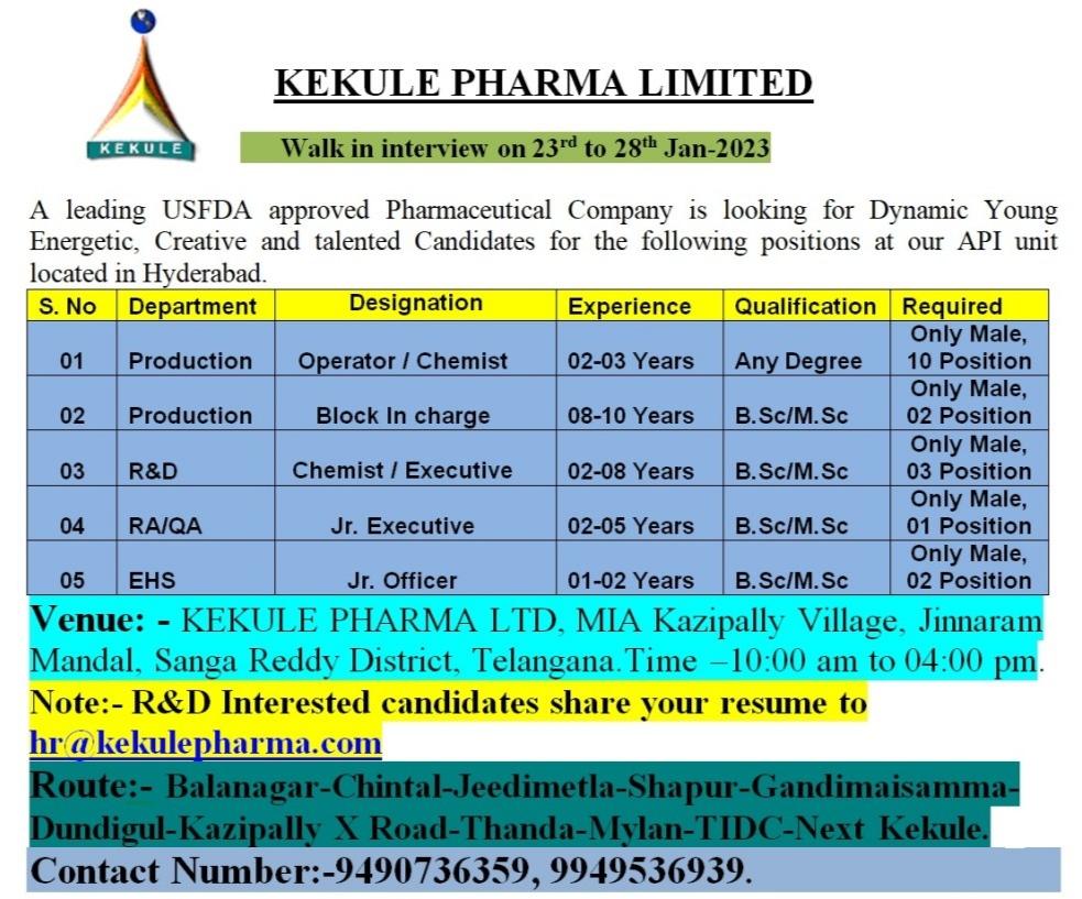 KEKULE PHARMA- Walk in interview for Production, R&D, RA, QA, EHS on 23rd to 28th Jan-2023