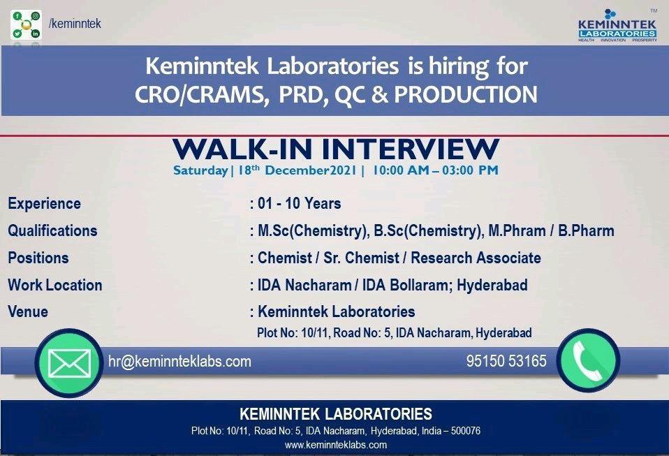 Keminntek Laboratories ,Walk-In Interviews for CRO/CRAMS, PRD, QC & Production on 18th December 2021.