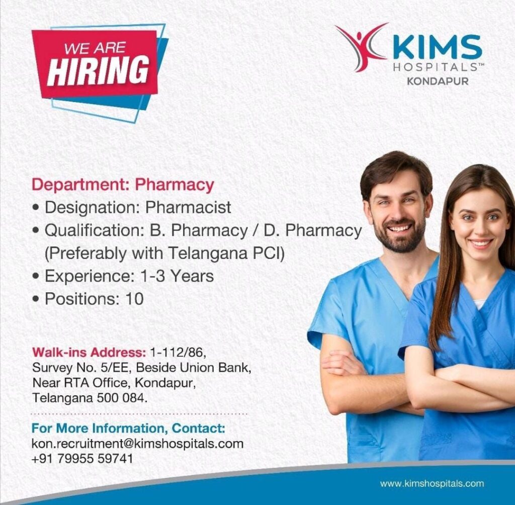 KIMS Hospitals, Kondapur, one of the most trusted healthcare institutions in Telangana, has announced multiple openings for Pharmacists in their Pharmacy Department. This is a great opportunity for qualified pharmacy professionals seeking to build a rewarding career in a reputed hospital environment.