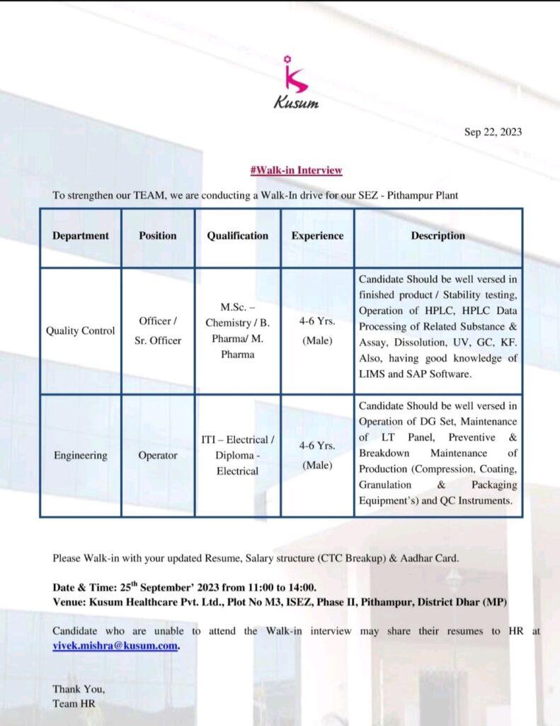 Candidate who are unable to attend the Walk-in interview may share their resumes to HR at vivek.mishra@kusum.com.
