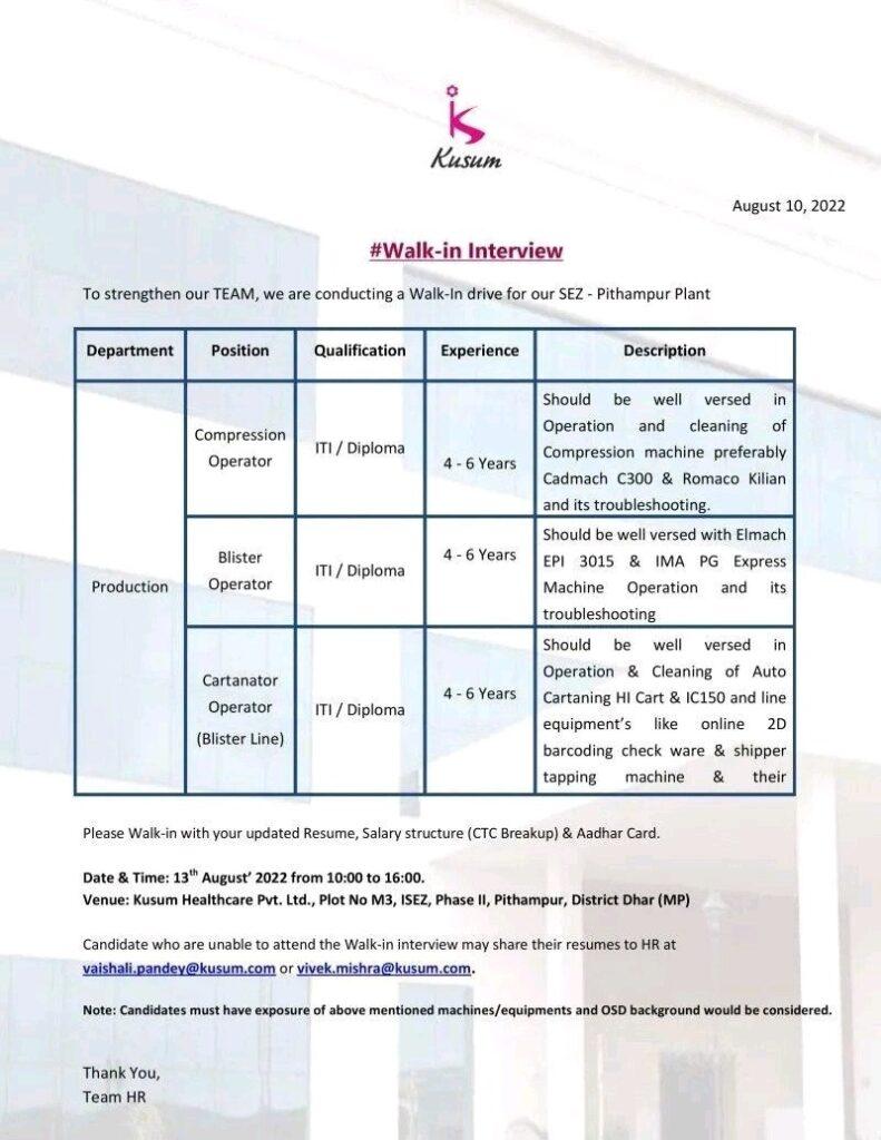 Kusum Healthcare Pvt. Ltd Walk In Interview for Compression, Blister, Cartonator Operator on 13th August 2022