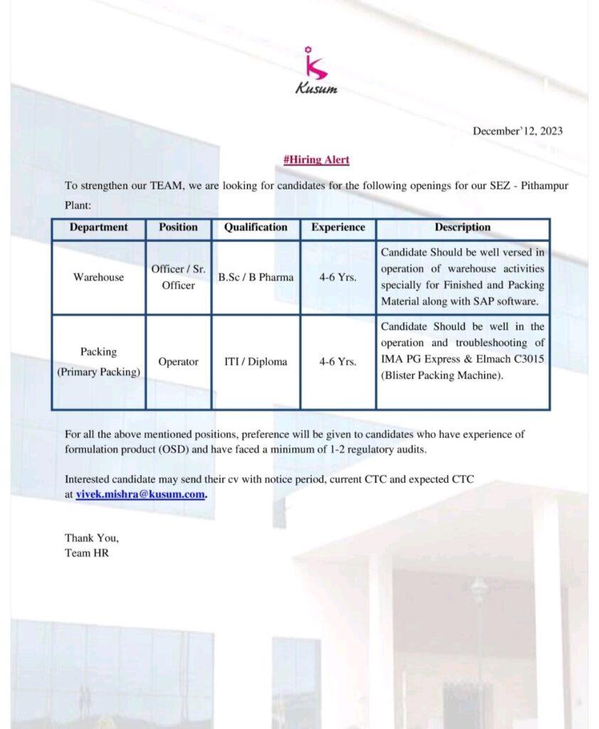 Kusum hiring for Operator, Officer/ Sr. Officer- Warehouse, Packing (Primary Packing) department