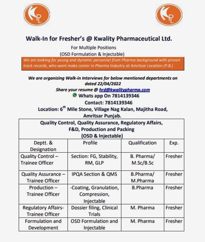 Walk-In for Fresher’s @ Kwality Pharmaceutical Ltd.