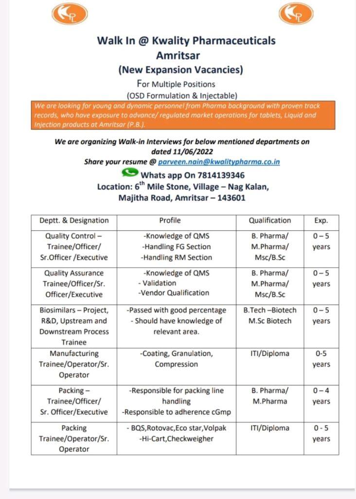 Walk In @ Kwality Pharmaceuticals Amritsar (New Expansion Vacancies)