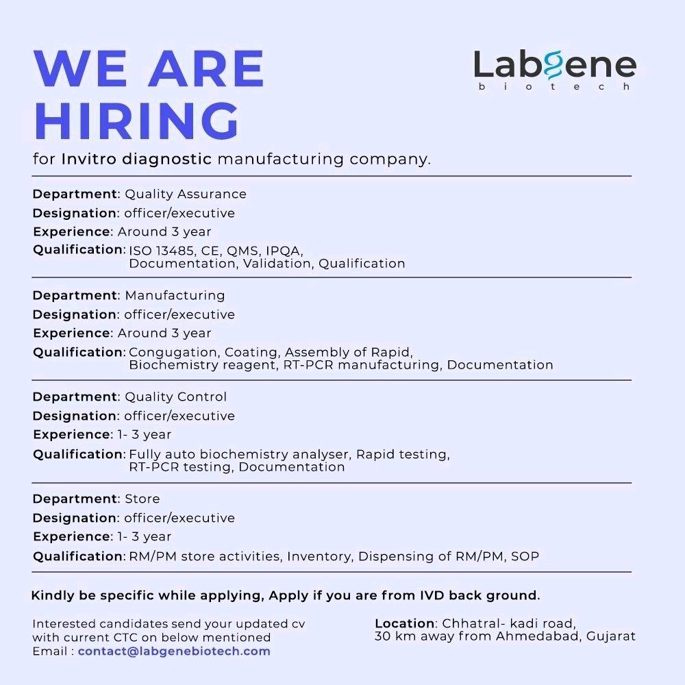 Labgene is hiring experienced candidates for various position in Invitro diagnostic manufacturing at Ahmedabad.